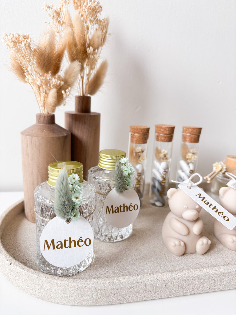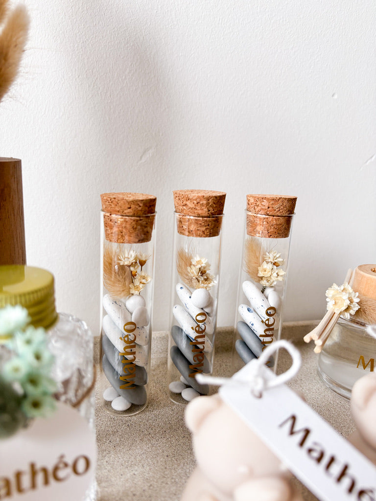 GlaswerkMet deze proefbuisjes voeg je een veelzijdig item toe aan je doopsuiker. Je kan ze vullen met suikerbonen, snoepjes, badzout...
