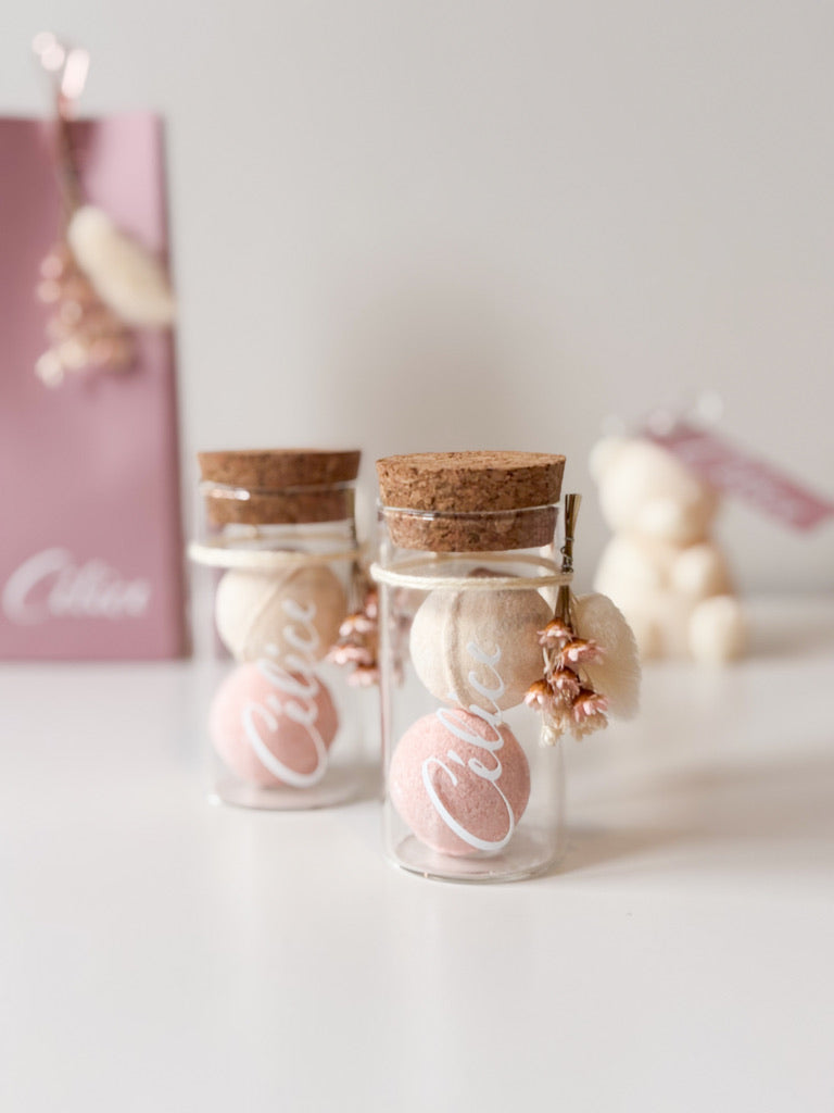 Dit glazen proefbuisje (7 cm hoog, 3,5 cm diameter) met kurken dop is perfect voor het verpakken van suikerbonen, snoepjes of bruisballetjes. Dankzij het stijlvolle en minimalistische design past het in elk doopsuiker thema en is het eenvoudig te personaliseren met een vinylsticker, label of touwtje.