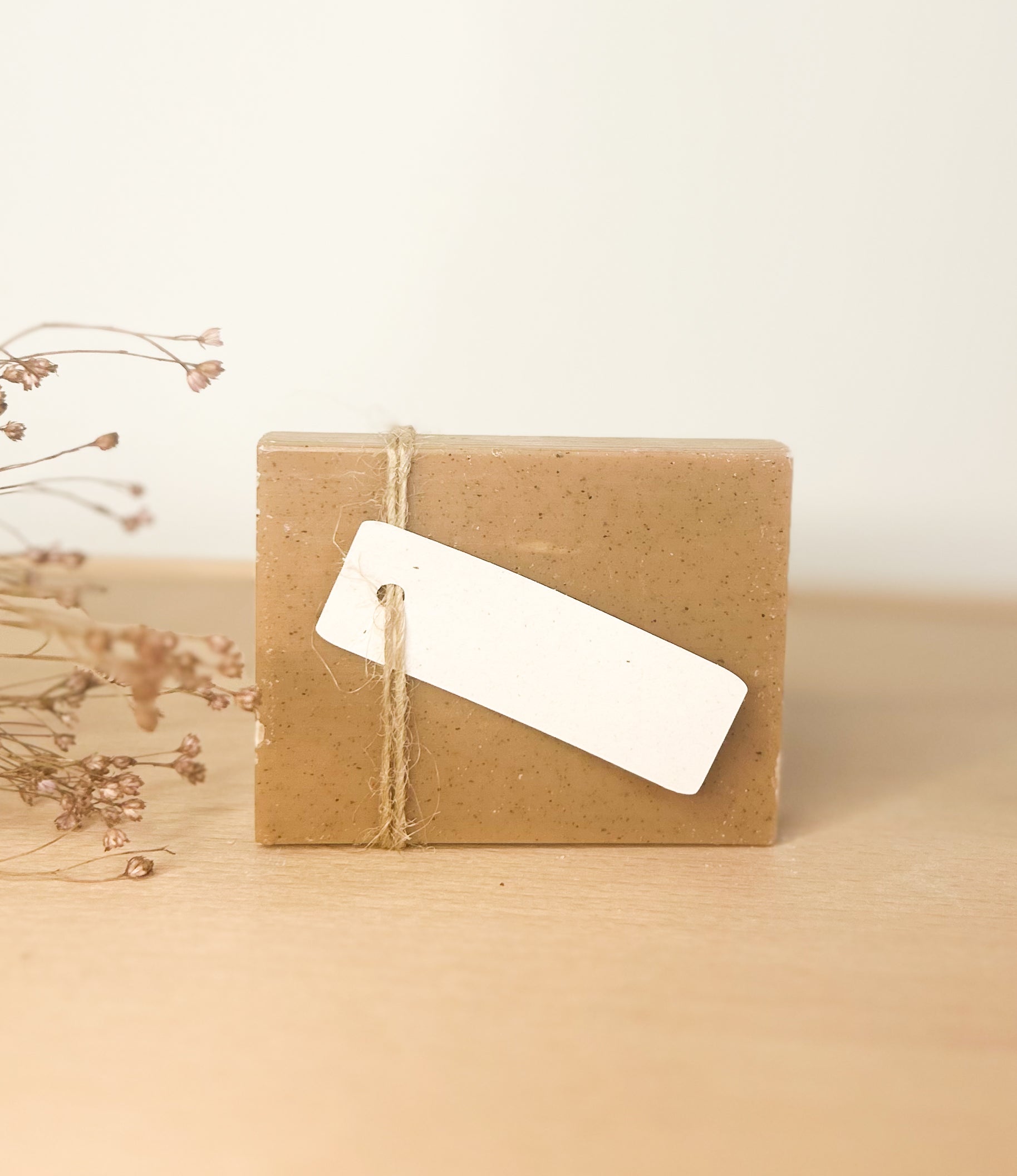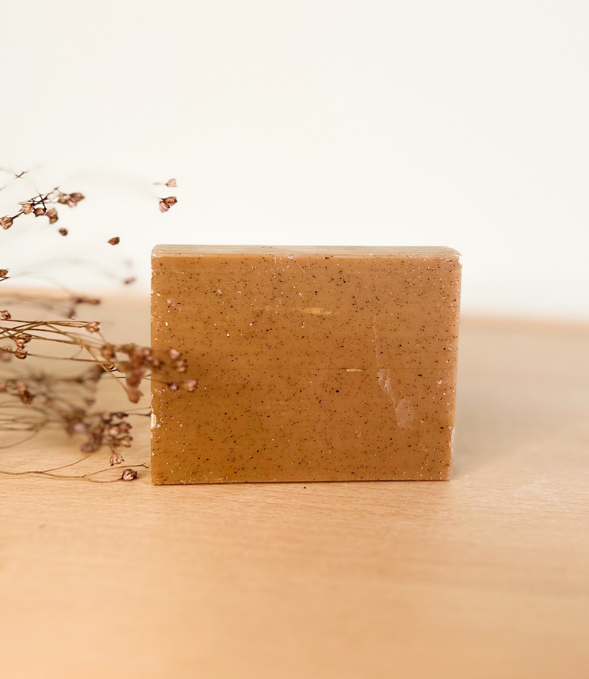 Bruin zeepje met spikkeltjes en een warme, zachte ambergeur. Ideaal voor een natuurlijk, rustgevend of herfstig doopsuikerthema met een artisanale uitstraling.